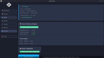 It scans your entire setup — dock, display, USB-C cable, and power — and gives you a clear report on what’s working, what’s not, and what to try next. No more blind restarts or forum diving.